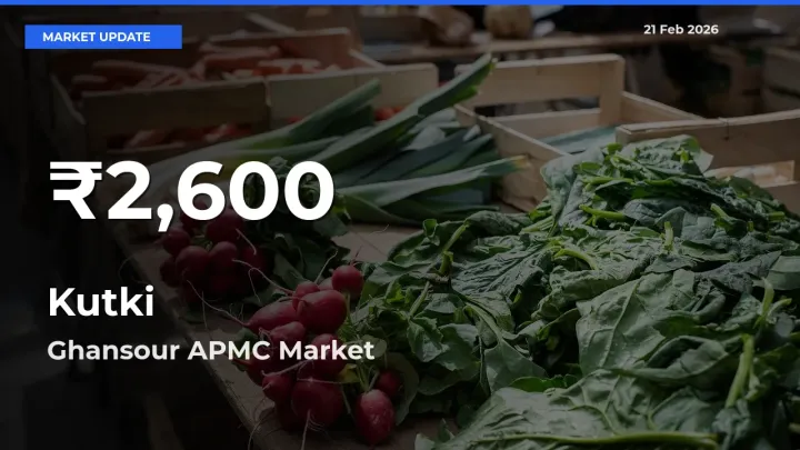 On 21 Feb 2026, Kutki prices dropped to ₹2600 per quintal in Ghansour APMC.