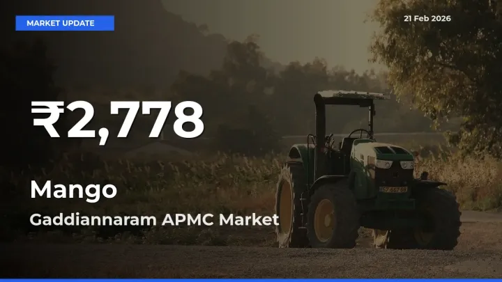 On 21 Feb 2026, Mango prices dropped to ₹2777.8 per quintal in Gaddiannaram APMC.