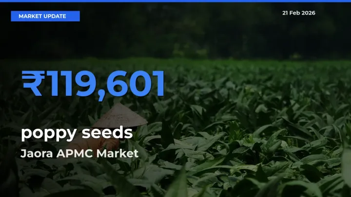 On 21 Feb 2026, Jaora APMC emerged as the top-performing mandi for poppy seeds, recording the highest traded price of ₹119,601 per quintal. Among all reporting markets, this mandi outperformed peers, setting the benchmark for the day.