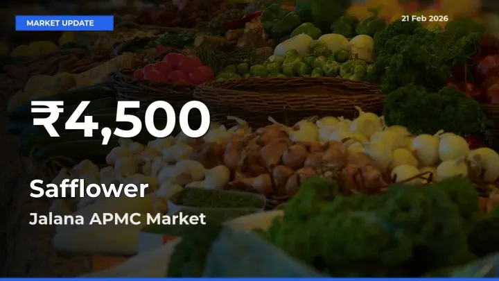 On 21 Feb 2026, Safflower prices dropped to ₹4500 per quintal in Jalana APMC.