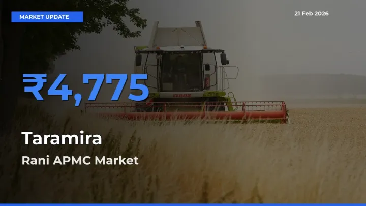 On 21 Feb 2026, Rani APMC emerged as the top-performing mandi for Taramira, recording the highest traded price of ₹4,775 per quintal. Among all reporting markets, this mandi outperformed peers, setting the benchmark for the day.